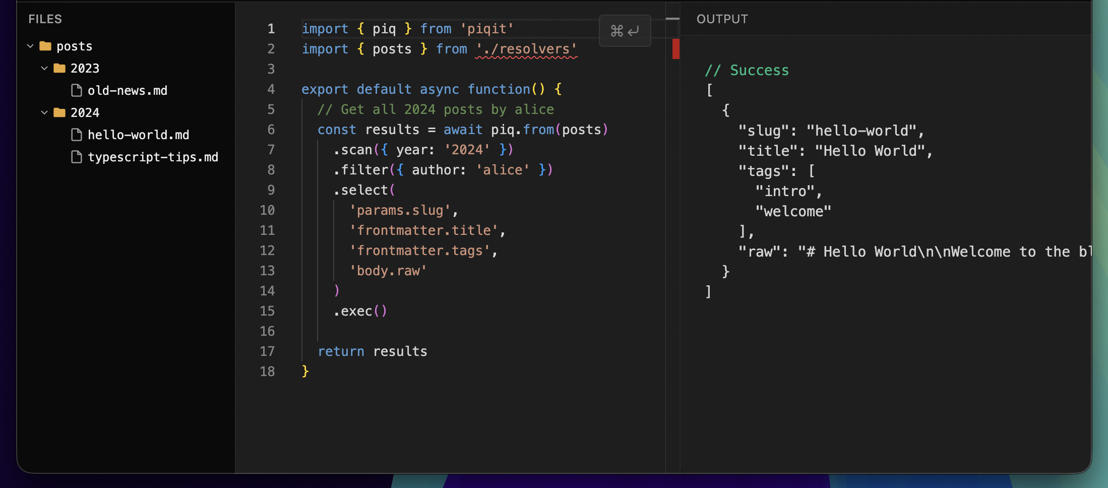 Piq began as a way to easily query those documents, inspired by Astro loaders, but evolving into a fully-fledged typed SDK for document storage. In every respect, it is the anti-GraphQL.